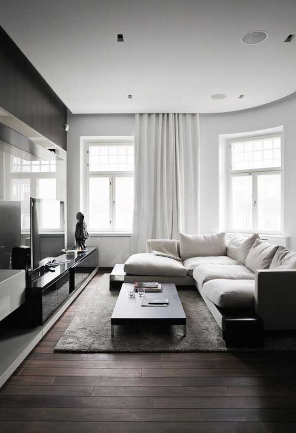 Философия стиля заложена в любовании пустотой и «безмолвной» эстетикой. Оптимальное решение для гостиной площадью 15 кв.м., если главной целью является создание визуального простора при сохранении максимальной функциональности. Нередко в таком интерьере применяется модели-трансформеры, которые позволяют рационально использовать каждый квадратный метр.