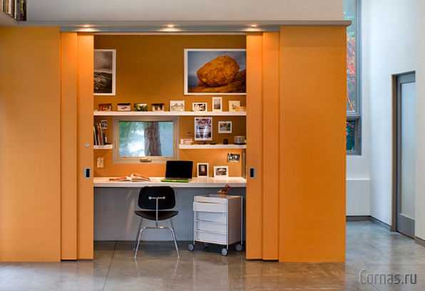 На западе весьма популярно размещать маленькие кабинеты в шкафах. По необходимости открываем створки и вуаля, пред нами кабинет. Поработали — закрыли — все кабинета нет. Очень удобно и эргономично. Но с точки зрения загруженности помещения — шкаф будет смотреться внушительнее, чем отдельно стоящий стол и кресло. Так что действуйте по обстоятельствам.