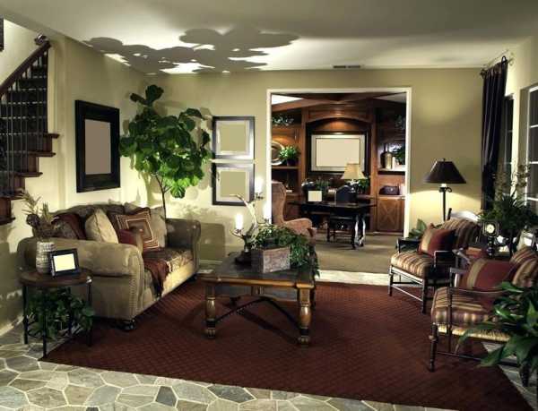В оформлении гостиной используют дерево, хлопковые ткани и другие натуральные материалы. Для классического стиля характерно присутствие центрального объекта (например, камина или дивана), вокруг которого выстраивается композиция.