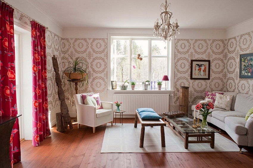 Теплые тона создают ощущение домашнего уюта, а сочетание однотонных и узорчатых обоев создаст разнообразие, не борясь за то, чтобы быть центром внимания. Если ваша мебель выполнена в стиле «смешай и подбирай» (его еще с любовью называют «находками с блошиного рынка»), то вам следует сочетать ее с обоями с неподвластным времени шармом, такими как полосатые обои или текстурированные однотонные обои. Например, деревянная мебель хорошо сочетается с натуральными цветами и цветочными обоями. А обои с эффектом ткани сделают вашу гостиную особенно уютной.