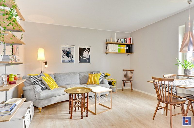 На фото – примеры гостиных в серо-желтых тонах, имеющих небольшую площадь.