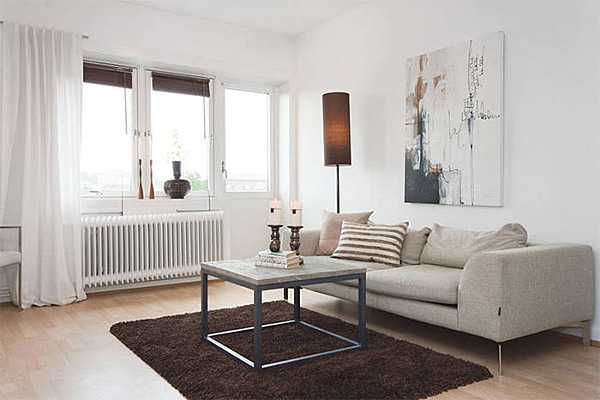 На бежевом фоне отлично смотрится мебель в шоколадных оттенках, словно сочетание горького и молочного шоколада. Мягкий диван с обивкой шоколадного цвета, кресла, коричневая стенка, дубовый стол и стулья, ковер и шторы цвета какао разбавят пастельный базовый оттенок комнаты. Такой дизайн добавит вам солидности и уверенности. А «шоколадная» корпусная мебель, диван и кресла, обитые текстилем молочного оттенка, превратят гостиную в роскошные апартаменты.