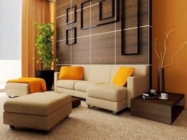Стенка в такой гостиной может быть в насыщенном темно-коричневом цвете или даже черном. А сочетание белых стен и бежевой центральной части комнаты визуально ее расширит. Желтые подушечки на диване цвета слоновой кости или вазы цвета солнца придадут помещению легкости, осветлят комнату. Важно учесть уровень теплоты оттенков: кислотный лимонный цвет в этом случае не подойдет.