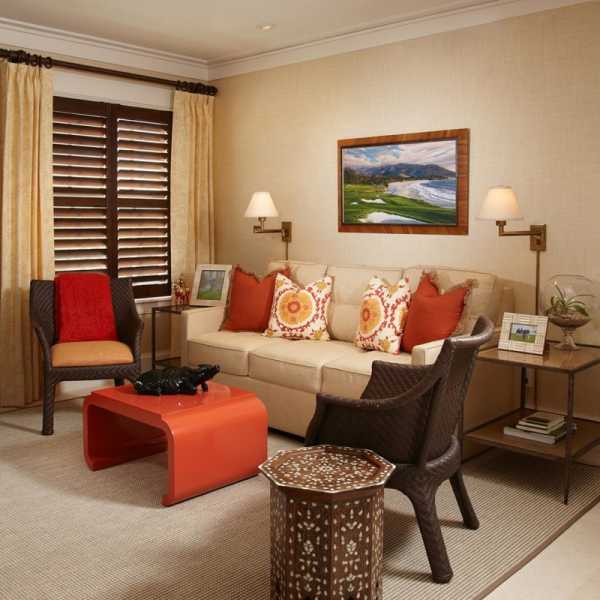 На фоне природного бежевого цвета хорошо смотрится плетеная мебель и картиныПри этой комбинации комната сужается по бокам, раздвигается в высоту и в сторону светлой стены. Рекомендуется для широких и коротких гостиных с низкими потолками. Цвет декора, штор и мебели контрастирует с общей отделкой и смотрится очень гармонично.
