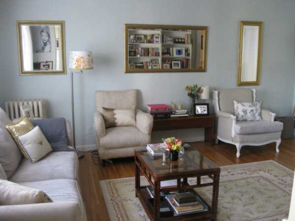 В этих комбинациях комната раздвигается в сторону и становится короче. Рекомендуется для узких и длинных гостиных.