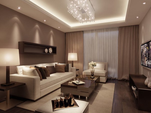Освещение в оформлении интерьера играет немаловажную роль. Небольшую комнату можно зрительно увеличить с помощью нескольких источников света. Чтобы в зале было всегда уютно и комфортно, стоит предусмотреть верхний свет и боковой. А любители романтики могут коротать вечера при свете свечей.10. Аксессуары для придания завершенного вида