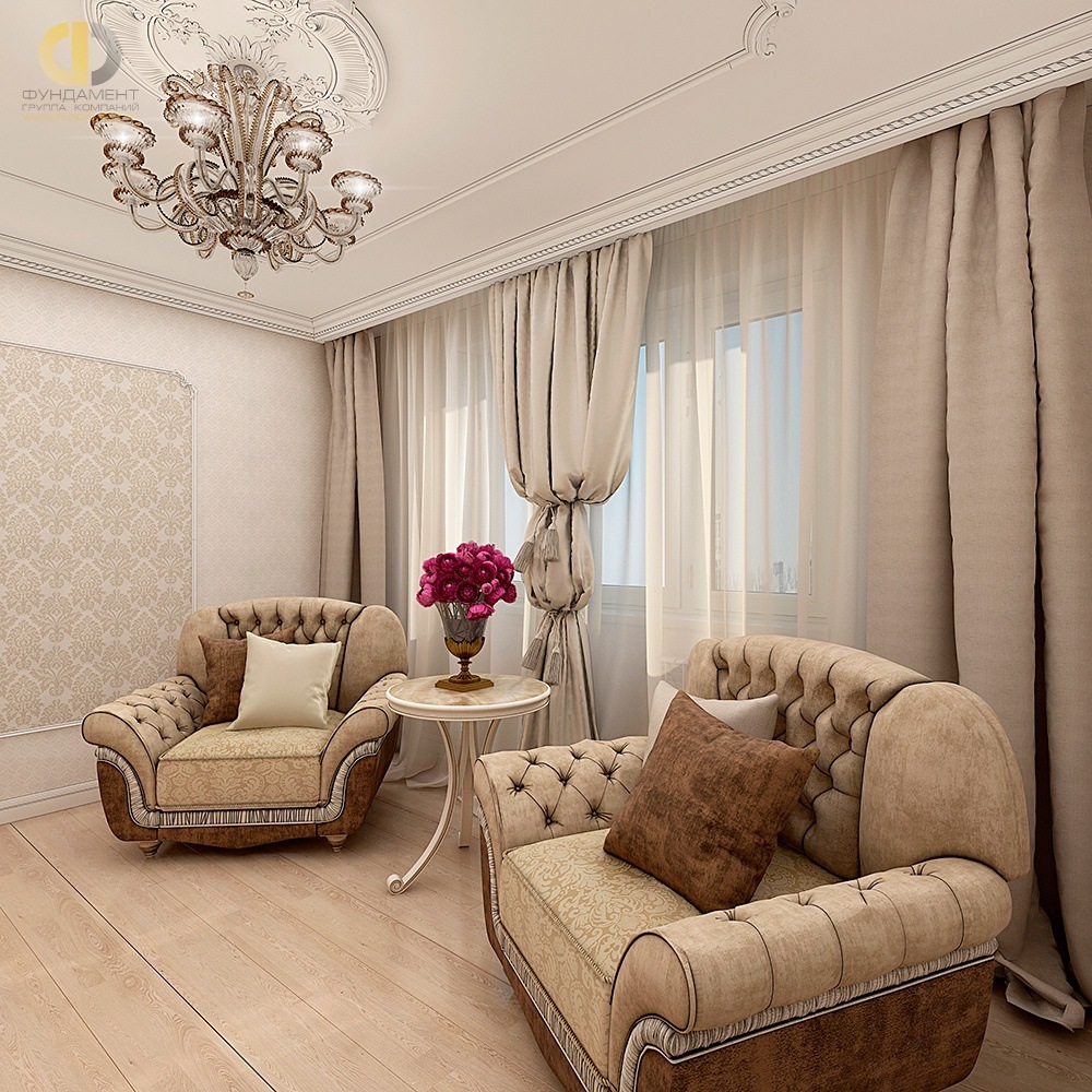 В ремонте классических гостиных используются достаточно дорогостоящие материалы. Ведь истинная классика предполагает внушительные сроки эксплуатации, а потому требует очень качественных элементов отделки. Здесь нельзя допустить того, чтобы обои потеряли свой презентабельный внешний вид через пару лет, а напольное покрытие требовало замены после каждого случайно пролитого напитка. Ниже мы приводим несколько примеров интерьеров гостиных в стиле классика после ремонта. Все фото взяты из портфолио ГК «Фундамент».