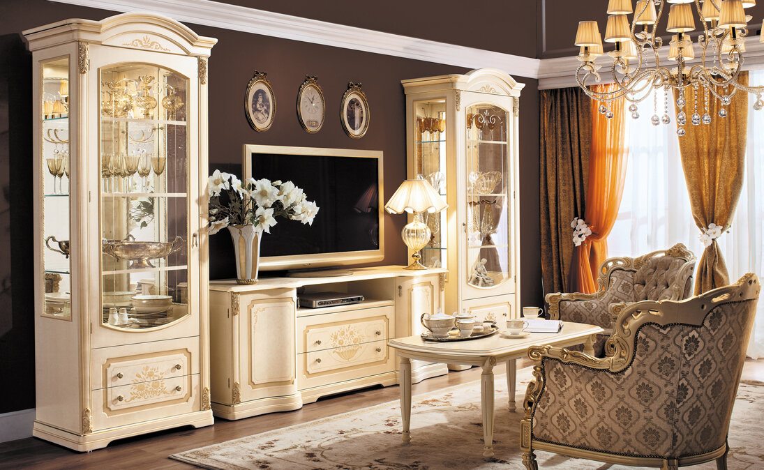 Современный интерьерный рынок предлагает богатый выбор мебели для классических гостиных: всевозможные буфеты, стилизованные под антиквариат, кресла-бержеры, диваны Честерфилд, напоминающие об Англии. Элементы меблировки здесь достаточно декоративны. В оформлении корпусной мебели активно применяется резьба по дереву. Что касается кресел и диванов, то они могут быть обиты текстилем с дамасским или цветочным узором.