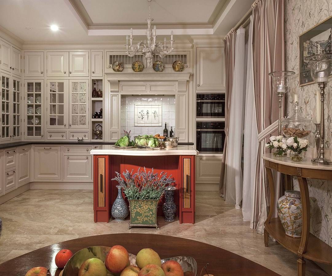 В основном такая стилистика такая подойдет просторной кухне в ней можно раскрыть все богатство и роскошь деталей.