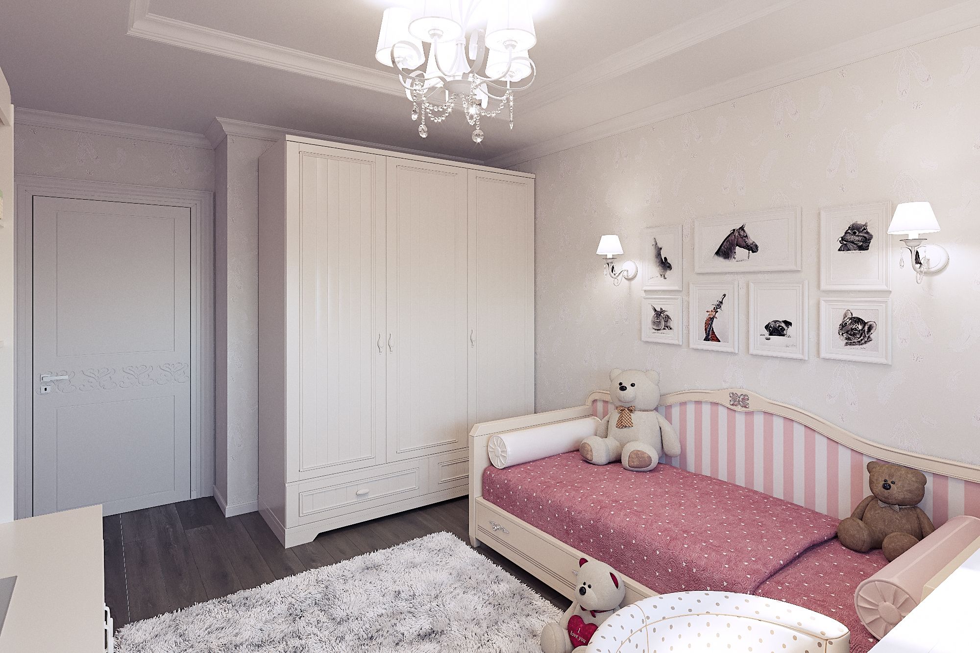 Светлые мягкие оттенки, присущие классическим стилистикам, прекрасно расширяют пространство, делая комнату просторнее и свежее. Грамотное использование вертикалей визуально сделало стены выше: рисунок обоев в изголовье продолжают расставленные на полке книги; вертикальные линии дублируются и в декоративных элементах шкафа.
