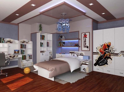 Подойдет такая спальня для мальчиков, которые имеют разные увлечения: музыку, спорт, рисование и т.д. Вы сможете пофантазировать своим ребенком, как он хочет украсить собственную комнату.