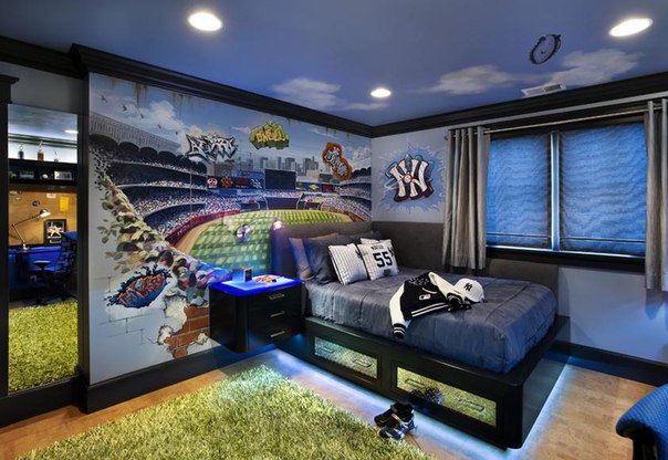Или изображение любимой спортивной игры на всю стену. Мальчикам, вообще, важно быть окруженными атрибутами своих увлечений, тогда они чувствуют себя уверенно.
