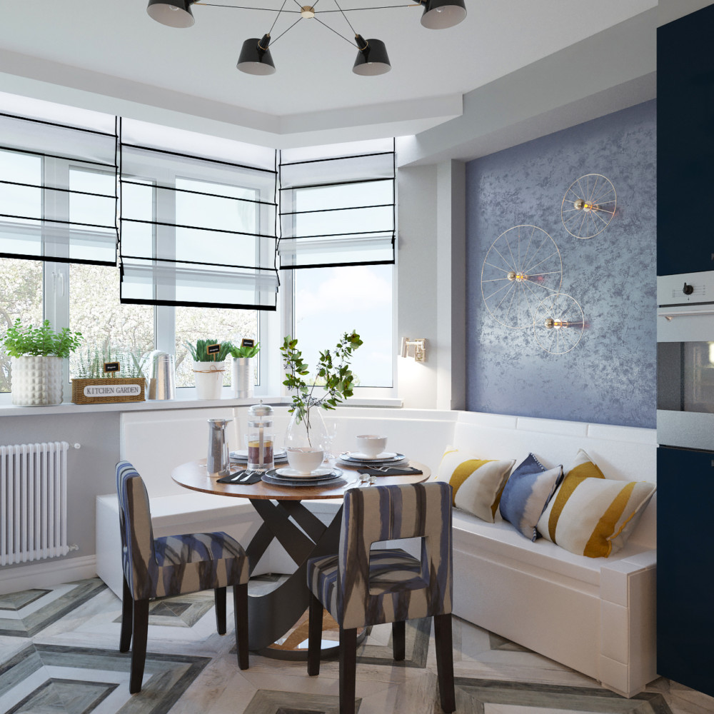 Небольшой диван на кухне можно разместить вдоль окна. Особенно этот вариант подходит для кухни с трапециевидным эркером, как, например, в этом проекте, разработанном для кухни в доме серии П-44Т. Здесь дизайнер выбрал Г-образную схему гарнитура, у окна поместил диван, повторяющий форму выступа, радиаторы закрыл декоративными экранами, трубы спрятал в фальш-колонну, а для симметрии сделал такую же колонну с другой стороны.