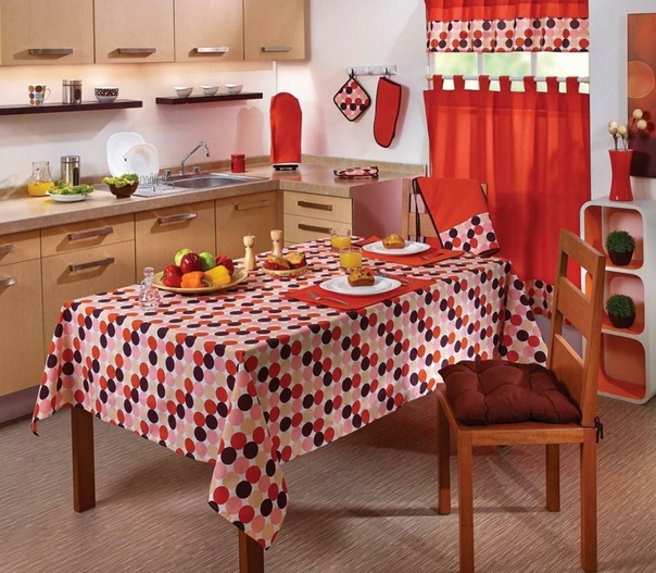 Красивая длинная скатерть на столе в тон салфеткам создадут поистине домашнюю, уютную атмосферу на кухне.