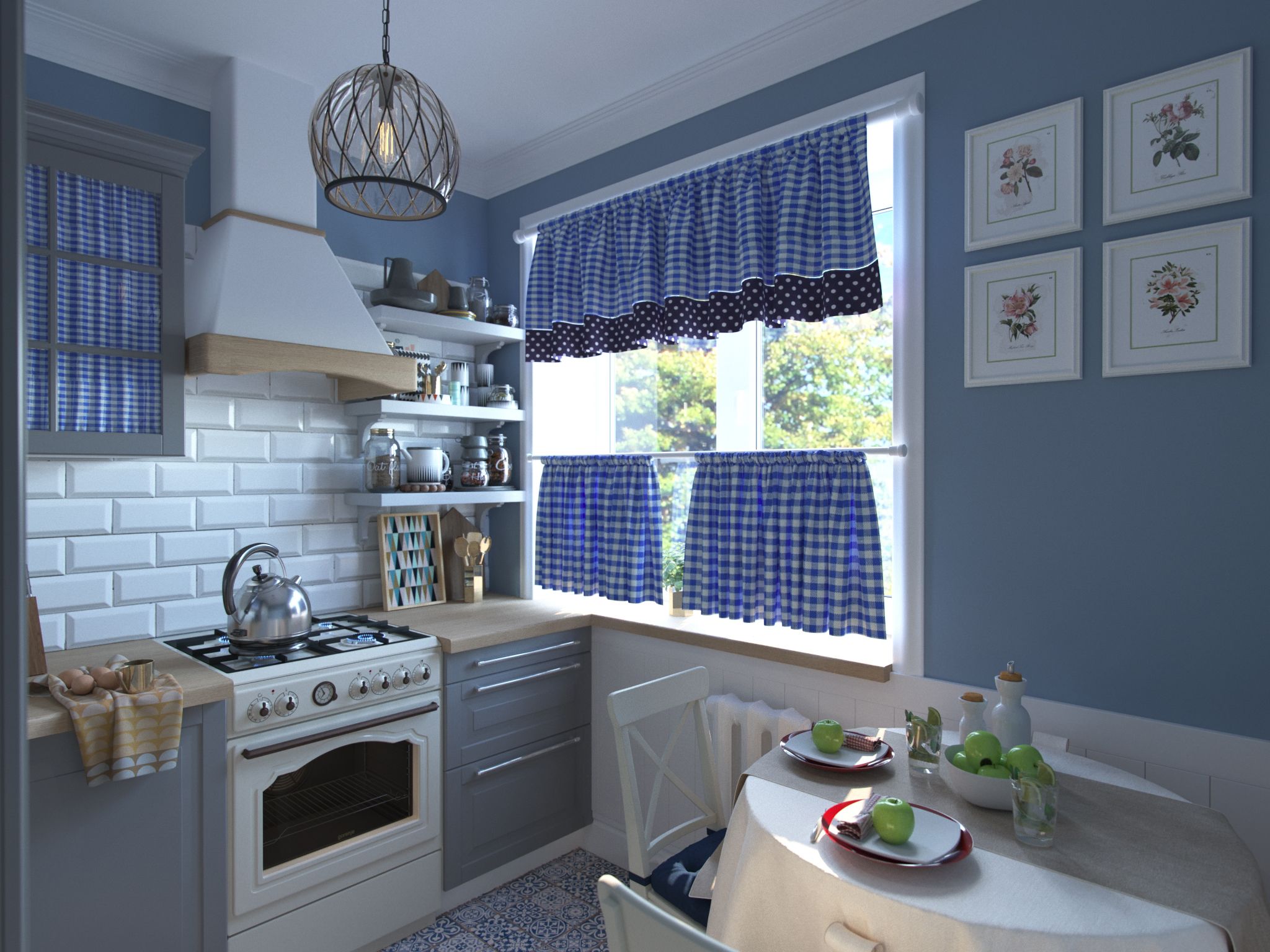 Обои, шторы и гарнитуры в серо-голубых тонах.