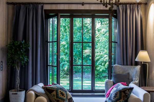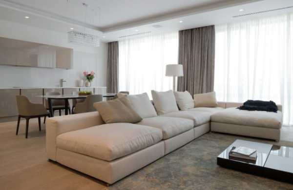 - Серьезно отнеситесь к выбору штор. Занавески из воздушной ткани зрительно расширят небольшую комнату. Если проблем с площадью помещения нет, обратите внимание на плотные шторы, которые предотвратят проникновение солнечных лучей в жаркий день. Если гостиная и кухня совмещены, занавески должны быть одинаковыми или сочетаться между собой.