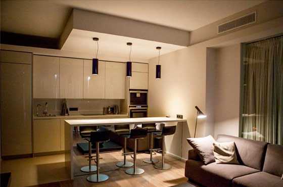 - многоуровневый подвесной потолок — обычно кухонную зону выделяют более низким потолком с более интенсивным освещением над рабочей поверхностью, использование иного типа освещения допустимо и в других зонах, удобнее если освещение в каждой зоне будет включаться отдельно и иметь несколько режимов;