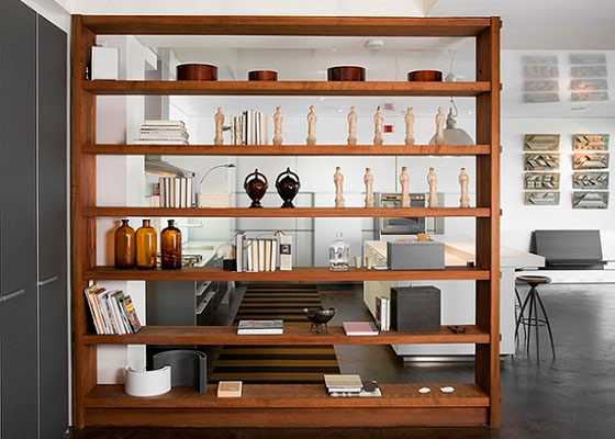Коль уже коснулись мебели, то почему бы не вспомнить и о стеллаже. С одной стороны, вещь на кухне незаменимая, а с другой – он с лёгкостью выполнит роль перегородки.