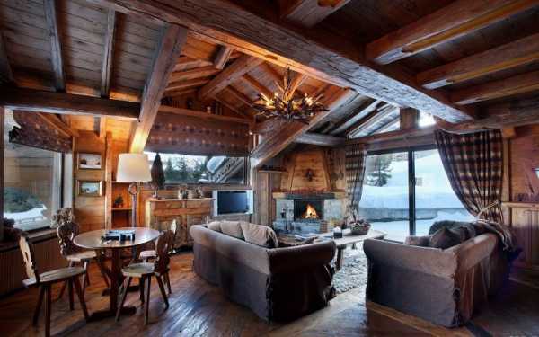 Также вместе с гостиной находится кухня и в деревянных домиках стиля шале. Мебель в таком камбузе обязательно вся деревянная и массивная, топорной работы. Глянец отсутствует вовсе. По возможности матируют даже духовой шкаф и мойку.
