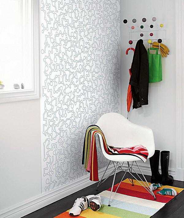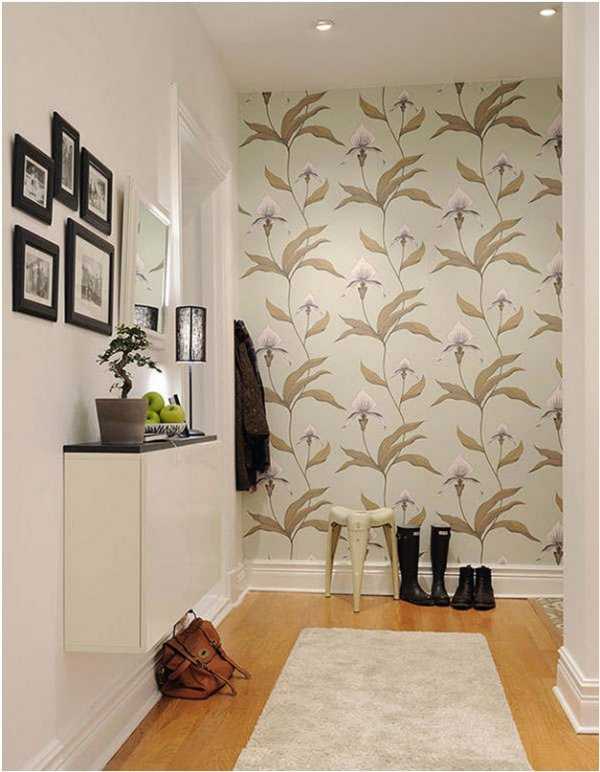 Стены, как уже говорилось, должны быть светлыми и легко мыться. В маленькой комнатке из-за нехватки места стены пачкаются чаще зонтами, мокрой одеждой и обувью. Есть отличные варианты с шелковыми нитями и винилом. Они смотрятся дорого, эффектно, а главное очищаются.
