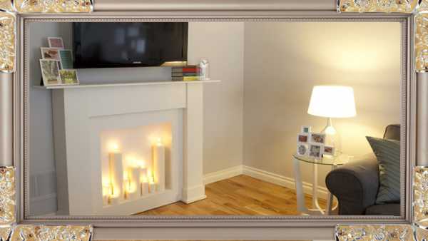 - Изготавливается красивый портал, для чего можно использовать любой подходящий материал. В образованную нишу укладывают обычные дрова. Выбирают красивые поленья, их можно покрыть строительным лаком. Вокруг устанавливают свечи в подсвечниках, при горении которых возникает иллюзия, будто пылают дрова. Создать такую декорацию несложно, она не потребует финансовых вложений, а эффект будет впечатляющим.