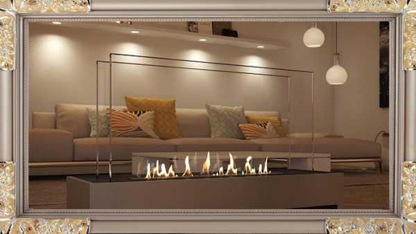 Для больших квадратных гостиных хорошим вариантом будет островной комнатный электрический камин. Его устанавливают в центре комнаты, теплота и свет от «огня» распространяется по всему помещению.