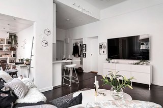 Зачастую маленькие квартиры-студии не позволяют разместить на площади 40 кв.м. спальню и гостиную, поэтому многие отказываются от спальни в пользу более просторной гостиной. Конечно, ничто не может сравниться с удобной кроватью, на которой будете спать только вы, но зато вы существенно сэкономите пространство, если совместите спальню с гостиной.