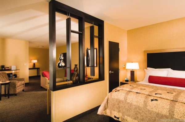 Довольно-таки популярен вариант, когда возводятся перегородки, разделяющее спальную зону от гостиной, или просмотра ТВ. На самом деле материалы для их возведения могут использоваться самые разные. А один из наиболее популярных – гипсокартон. Также Вы можете отгораживать зоны комнаты при помощи шкафа, штор, стеллажа с книгами и прочим и т. д.
