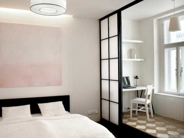 Тем прекрасен вариант, что создается видимость цельного пространства при раскрытой двери, и комната делится на две части, если в этом есть смысл. Этот вариант актуален в том случае, если квартира-студия и есть потребность в выделении угла комнаты для рабочего кабинета.