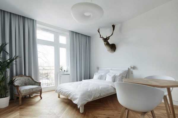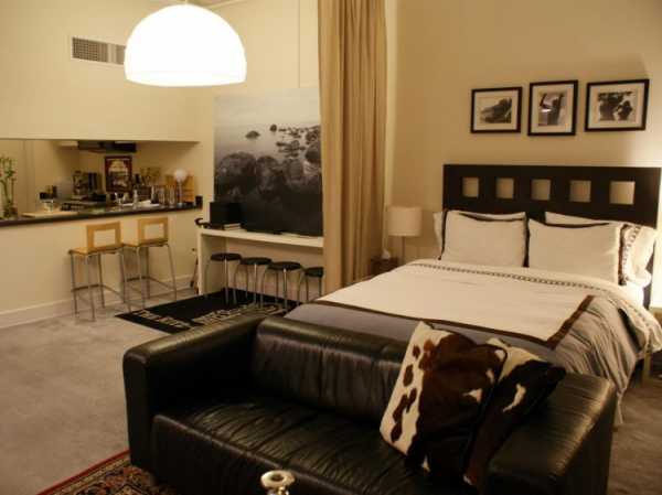 Идеальным местом в 1 комнатной студии для размещения спального гарнитура будет возле оконного проема, который можно декорировать короткими шторами. Такие занавеси не будут забирать «лишние» сантиметры полезной площади, уход за ними будет проще, а их эксплуатация более легкой. Дизайн получится очень удачным, а планировка функциональной.