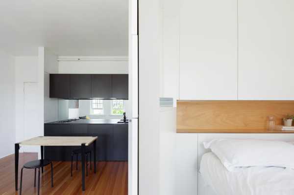 Спальня искусно скрывается за прозрачной дверью, а кухня мелодично отделена барной стойкой.