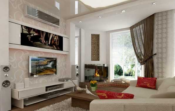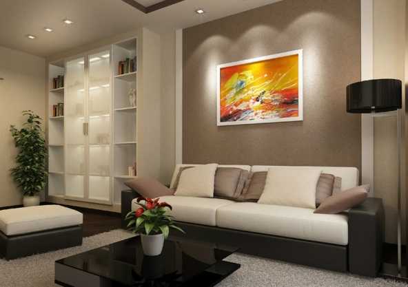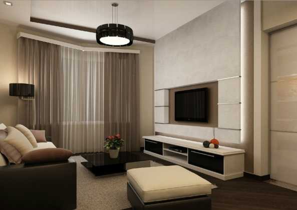 Оптимально в гостиной разместить удобный мягкий диван и зону отдыха для приема друзей. В углу может расположиться вместительный шкаф-купе с большим количеством полок. Данный предмет не будет смотреться объемно, если подобрать соответствующее сочетание цветов, в котором шкаф будет сливаться с основной стеной. В проект можно включить несколько стульев и небольшой столик, расположенные в центре, чтобы было комфортно пить чай за приятной беседой с гостями.