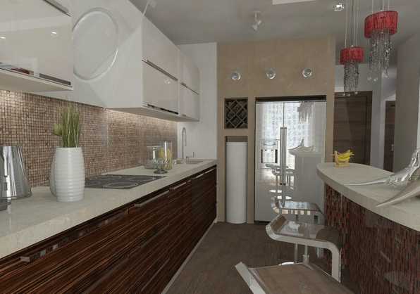 Проект, где оформление кухни делается преимущественно в глянцевых поверхностях, устанавливается раздвижной стол, наблюдается четкое разделение площади поможет визуально увеличить пространство, без потери функциональности.