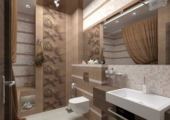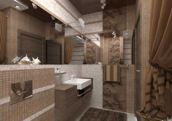 Ванная комната представлена в кофейном тоне. Крохотная площадь визуально выглядит объемнее за счет огромного зеркала и подвесной сантехники. Мозаичная отделка прибавляет благородства, шика и лоска.