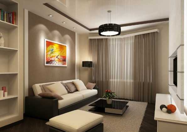 Спокойная и эффектная гамма, состоящая из черных, бежевых и белых тонов в гостиной умиротворяет легкостью, мягкостью и теплом. Живописная картина на стене, журнальный столик с глянцевой поверхностью, мягкий диван с множеством подушек, пушистый палас и невесомые шторы создают ласковую атмосферу с мотивами изящества, тонко дополняя друг друга.
