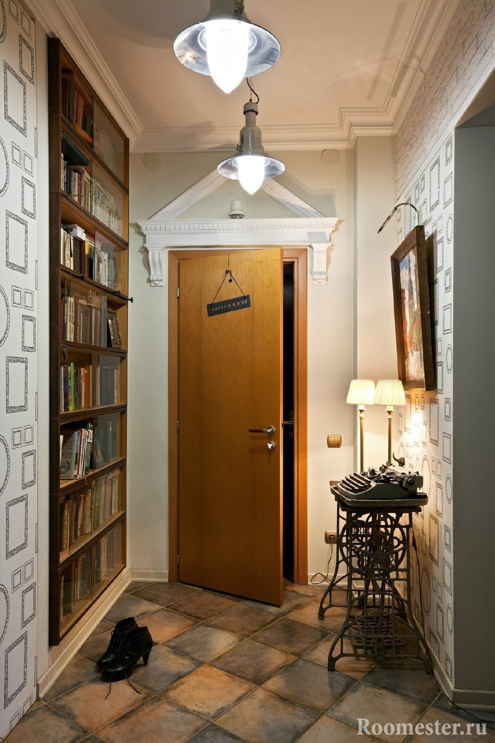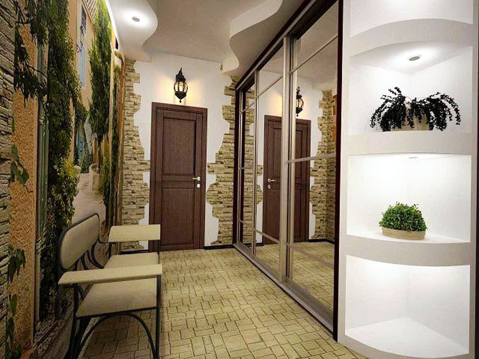 Стильная прихожая комната в хрущевкеДизайн маленькой прихожей с камнямиСветильники прекрасно поддержат атмосферу, выполнят свою функцию и разнообразят интерьер. В хай-тек используют инновационные модели необычного вида, например, акустические лампы стильного дизайна. Для лофт уместны ретро-варианты — небольшие фонарики, собранные в гирлянду, цепь.