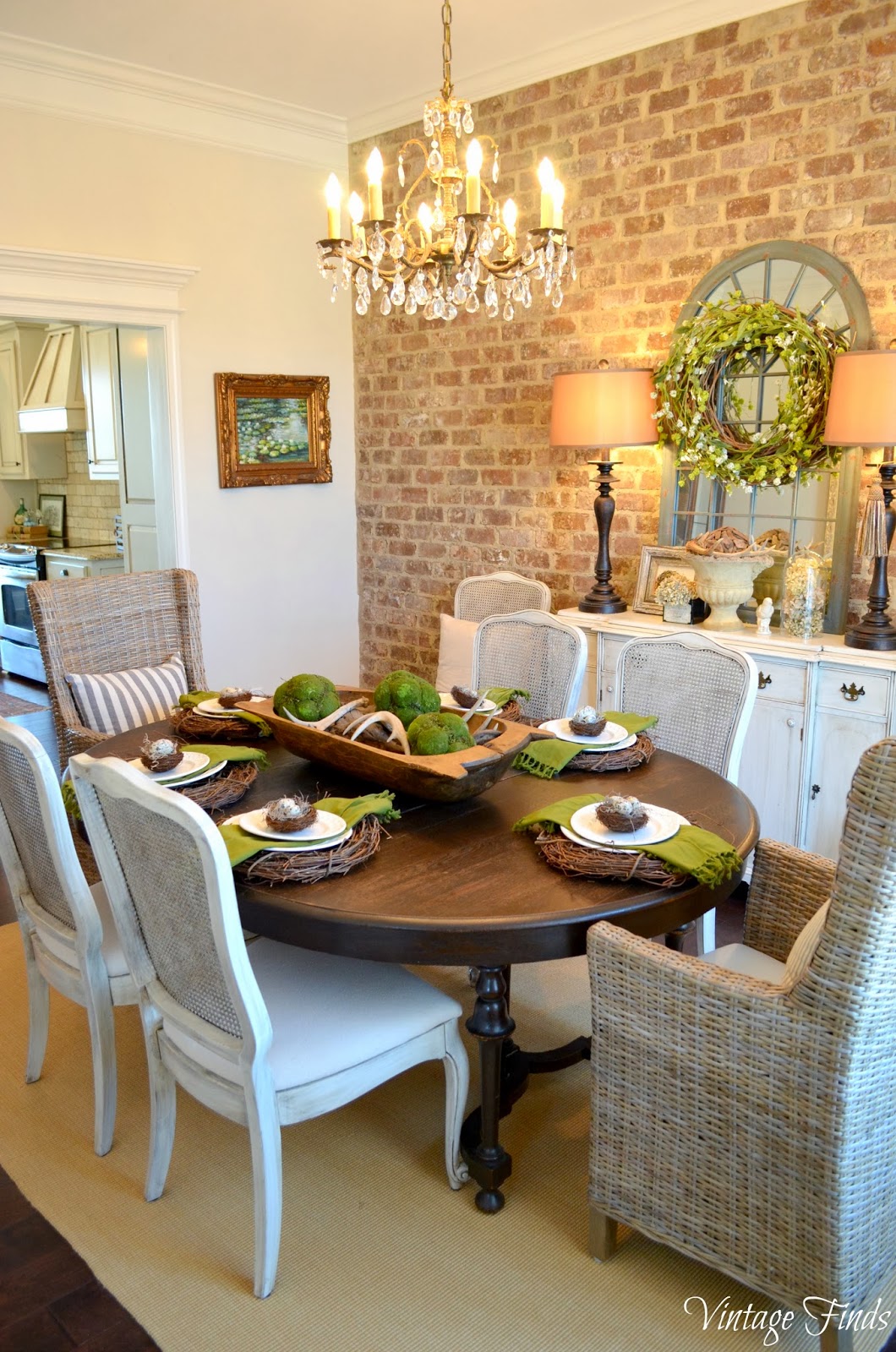 Обои – самый распространенный вариант отделки столовой зоны. Можно сочетать приглушенные однотонные обои с более яркой декорированной вставкой в зоне стола. Нередко для разграничения обои сочетают с окрашенными в тон стенами.