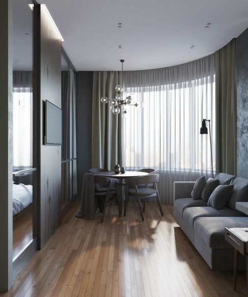 Кровать можно отделить ширмой или занавеской в тон мебели. Хорошим местом для нее будет щель за коридором. Таким образом, вы получите незаметное спальное место, не утяжеляющее пространство.