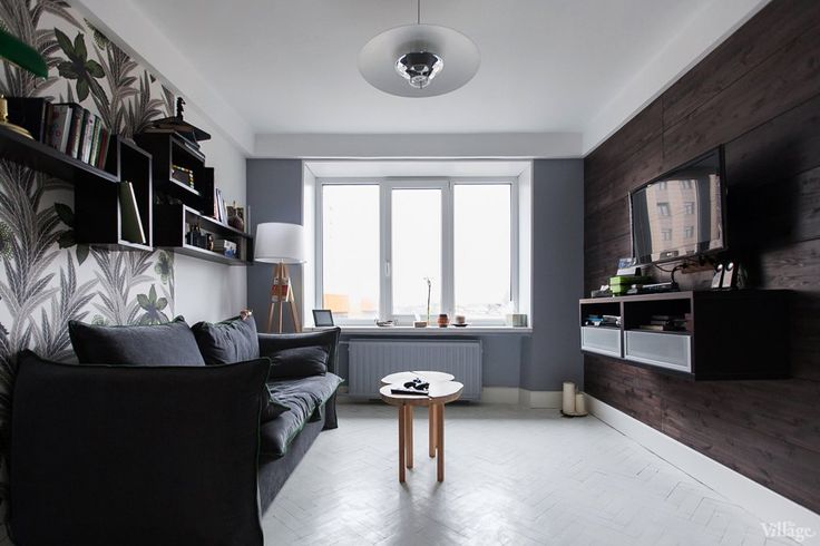 Центр композиции составляет акцентная тёмно-серая стена с телевизором – три окна позволили использовать этот приём без опасений. Диван играет роль спального места по ночам. Справа от него расположился письменный ретро-стол, а система хранения представлена шкафом-купе с белыми дверями, сливающимися со стенами.