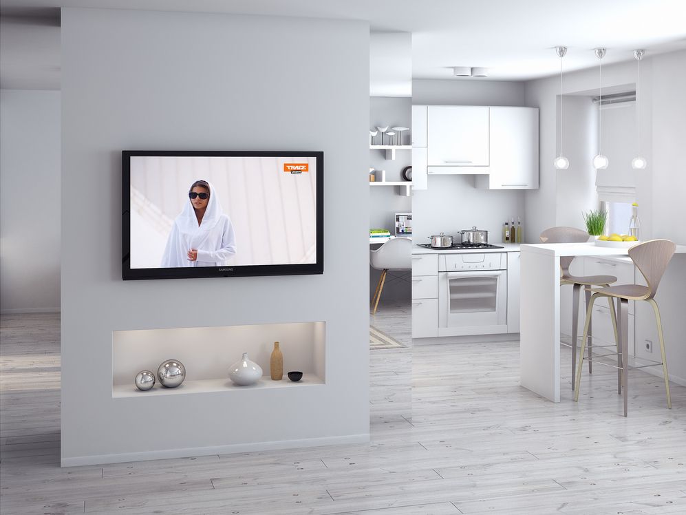 Отделить спальню от гостиной можно стеллажом со встроенным телевизором, который при необходимости поворачивается в ту или иную сторону.