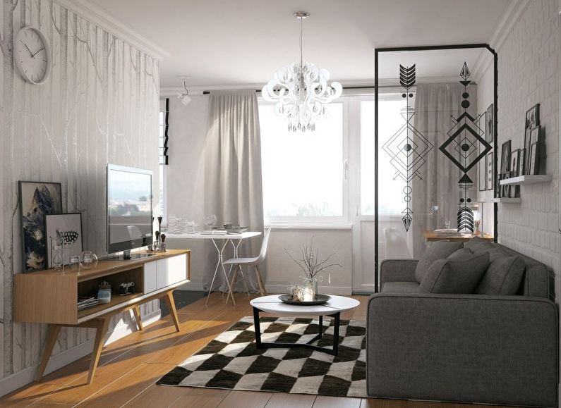 Чтобы не сжимать их до весьма скромных размеров, придется отказаться от коридора. Освободившееся пространство используется как кухонный уголок или пристраивается к одной из комнат. Что касается вариантов зонирования, то их гораздо больше, чем может показаться на первый взгляд. Самый простой способ — перейти от полноценных стен к облегченным перегородкам. Правда, этот способ подходит только для одиночек, а при проживании 2 человек стена из гипсокартона все равно занимает недопустимое количество места.