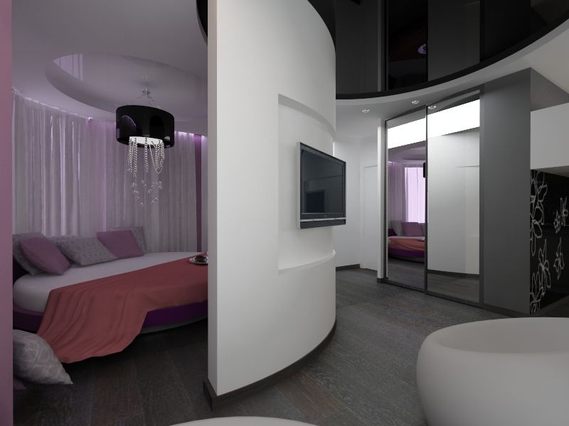Для размещения вещей выбирайте шкафы-купе. Чтобы благодаря им еще и увеличить пространство, купить модель с зеркальной поверхностью. - Спальня. Дизайн проект такой миниатюрной квартиры обязательно должен включать полноценное пространство для сна. Двуспальная кровать сильно захламит помещение, поэтому ограничьтесь диваном. Но при желании в квартире-студии или однушке можно внедрить и кровать под потолок или вмонтировать ее в нишу. Еще один вариант — поставить кровать на подиум, который становится хорошим местом для хранения несезонной одежды, обуви. Настолько продуманное задействование площади позволит разместить здесь же тумбочки, пуфики, несколько шкафчиков и телевизор.