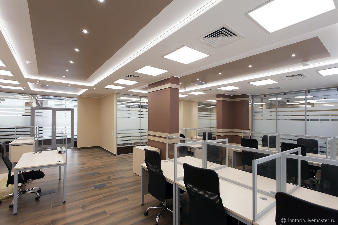 - использование мобильных перегородок из оргстекла, позволяющих зонировать рабочее пространство в зависимости от специфики деятельности офиса;