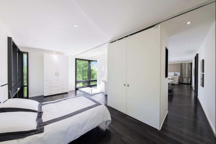В северной части штата Нью-Йорк пол главной спальни выкрашен в белый голубь Бенджамина Мура. Лампа была куплена в Лондоне, а кресло в стиле английского Регентства сохранило свою оригинальную кожу.