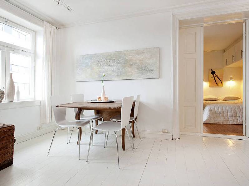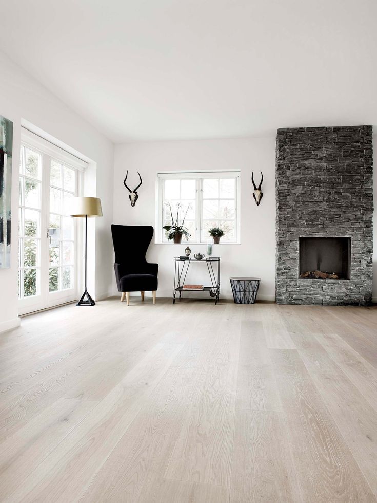 Кроме выбеленного дерева, хорошо выглядит ламинат с расцветкой под натуральное дерево белого цвета, плитка и линолеум под дерево. - Скандинавский и минимализм. Схожие по своей идее сдержанные, с налетом норвежского уюта направления ценят наличие свободного пространства, строгие геометрические формы и минимум декора. Дизайн интерьера с белым полом — своеобразная «фишка» этих направлений. Именно светлое покрытие помогает добавить свежести и визуально расширяет пространство.