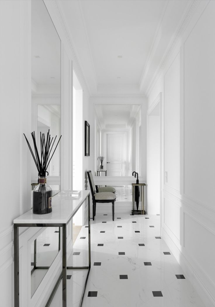 Рассмотрим этот коридор. И пол белый, и белые стены, и отделка. Это простой, но эффективный стиль, который хорошо работает в современных и традиционных домах. Кроме того, когда эти полы сочетаются с темной мебелью, это обеспечивает необходимый контраст и согревает вид комнаты.