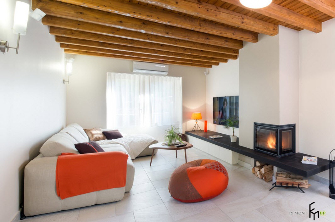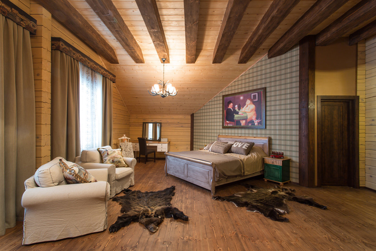 Деревом в интерьере не стоит злоупотреблять, перенасыщенность принесет только негативное впечатление. Если есть желание выделить наличие древесины, стоит это сделать, например, по краю потолка или ограничиться продольными балками. При этом расцветку пола следует подобрать на несколько тонов темнее потолка, а в оформлении стен обойтись без навязчивого декора.