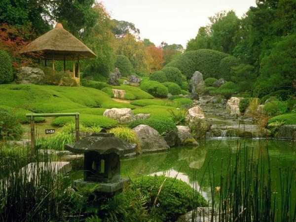 Π‘ΡΠ΅Π΄ΠΎΡΠΎΡΠΈΠ΅ ΡΠΏΠΎΠΊΠΎΠΉΡΡΠ²ΠΈΡ ΠΈ ΠΌΠΈΡΠ°, ΠΌΠΈΠ½ΠΈΠ°ΡΡΡΠ½Π°Ρ ΠΌΠΎΠ΄Π΅Π»Ρ ΠΏΠ΅ΠΉΠ·Π°ΠΆΠ° (Ρ ΠΎΠ»ΠΌΠΈΡΡΠΎΠ³ΠΎ ΠΈΠ»ΠΈ ΡΠΎΠ²Π½ΠΎΠ³ΠΎ), ΠΎΠ±ΡΠ·Π°ΡΠ΅Π»ΡΠ½ΠΎ β Π²ΠΎΠ΄ΠΎΠ΅ΠΌ, ΠΎΡΠΈΠ³ΠΈΠ½Π°Π»ΡΠ½ΠΎ ΡΠ°ΡΠΏΠΎΠ»ΠΎΠΆΠ΅Π½Π½ΡΠ΅ ΠΌΠ°ΡΡΠΈΠ²Π½ΡΠ΅ ΠΈ Π½Π΅ ΠΎΡΠ΅Π½Ρ ΠΊΠ°ΠΌΠ½ΠΈ, Π΄Π΅ΠΊΠΎΡΠ°ΡΠΈΠ²Π½ΡΠ΅ Π»Π°ΠΌΠΏΡ, ΡΠΎΠ·Π΄Π°ΡΡΠΈΠ΅ Π½Π΅ΠΎΠ±ΡΡΠ½ΠΎΠ΅, ΡΡΠΊΠΎΠ»ΡΠ·Π°ΡΡΠ΅Π΅ ΠΎΡΠ²Π΅ΡΠ΅Π½ΠΈΠ΅, Π·Π΄Π΅ΡΡ Π½Π΅Ρ ΡΠ΅Π·ΠΊΠΈΡ ΡΠ²Π΅ΡΠΎΠ², Π½Π΅Ρ Π»ΠΈΡΠ½ΠΈΡ ΡΠ»Π΅ΠΌΠ΅Π½ΡΠΎΠ², ΠΊΠ°ΠΆΠ΄ΡΠΉ Π½Π΅ΡΠ΅Ρ ΡΠ²ΠΎΡ ΡΠΌΡΡΠ»ΠΎΠ²ΡΡ Π½Π°Π³ΡΡΠ·ΠΊΡ. ΠΠ°ΡΠ»ΠΈΠΊΠΎΠ²ΡΠ΅ Ρ Π²ΠΎΠΉΠ½ΠΈΠΊΠΈ, ΡΠΎΠ΄ΠΎΠ΄Π΅Π½Π΄ΡΠΎΠ½Ρ, ΡΠ°ΡΠΏΠΎΠ»ΠΎΠΆΠ΅Π½Π½ΡΠ΅ Π½Π° ΡΠΎΠ½Π΅ ΠΌΡ Π°, ΠΌΠΎΠΆΠΆΠ΅Π²Π΅Π»ΡΠ½ΠΈΠΊΠΈ, Π²ΠΎΠ΄Π° ΠΈ ΠΊΠ°ΠΌΠ΅Π½Ρ β ΠΊΠΎΠΌΠΏΠΎΠ·ΠΈΡΠΈΡ ΡΠ°ΡΠΊΡΡΠ²Π°Π΅ΡΡΡ ΠΏΠΎΡΡΠ΅ΠΏΠ΅Π½Π½ΠΎ, Π½Π° ΡΠΎΡΠΎ ΠΎΠ½ ΠΊΠ°ΠΆΠ΄ΡΠΉ ΡΠ°Π· Π²ΡΠ³Π»ΡΠ΄ΠΈΡ ΠΈΠ½Π°ΡΠ΅. ΠΠ½ ΠΏΠΎΠΌΠΎΠ³Π°Π΅Ρ, ΠΎΡΡΠ΅ΡΠΈΠ²ΡΠΈΡΡ ΠΎΡ Π²Π½Π΅ΡΠ½Π΅ΠΉ ΡΡΠ΅ΡΡ, ΠΏΠΎΠ·Π½Π°ΡΡ ΠΈ ΠΎΡΡΡΠΈΡΡ ΠΊΡΠ°ΡΠΎΡΡ ΠΈ Π±Π΅ΡΠΊΠΎΠ½Π΅ΡΠ½ΠΎΡΡΡ ΠΎΠΊΡΡΠΆΠ°ΡΡΠ΅Π³ΠΎ ΠΌΠΈΡΠ°. Π ΠΏΠΎΡΠΊΠΎΠ»ΡΠΊΡ ΡΠΏΠΎΠ½ΡΡ β Π»ΡΠ΄ΠΈ ΠΎΡΠ΅Π½Ρ ΡΠΊΠΎΠ½ΠΎΠΌΠ½ΡΠ΅ Π² ΠΏΠ»Π°Π½Π΅ ΠΏΡΠΎΡΡΡΠ°Π½ΡΡΠ²Π°, ΡΠΎ 6 ΡΠΎΡΠΎΠΊ Π΄Π»Ρ Π²ΠΎΠΏΠ»ΠΎΡΠ΅Π½ΠΈΡ ΡΠ°Π΄Π° Π² ΡΠΏΠΎΠ½ΡΠΊΠΎΠΌ ΡΡΠΈΠ»Π΅ ΠΎΠΊΠ°ΠΆΠ΅ΡΡΡ Π΄ΠΎΡΡΠ°ΡΠΎΡΠ½ΠΎ.
