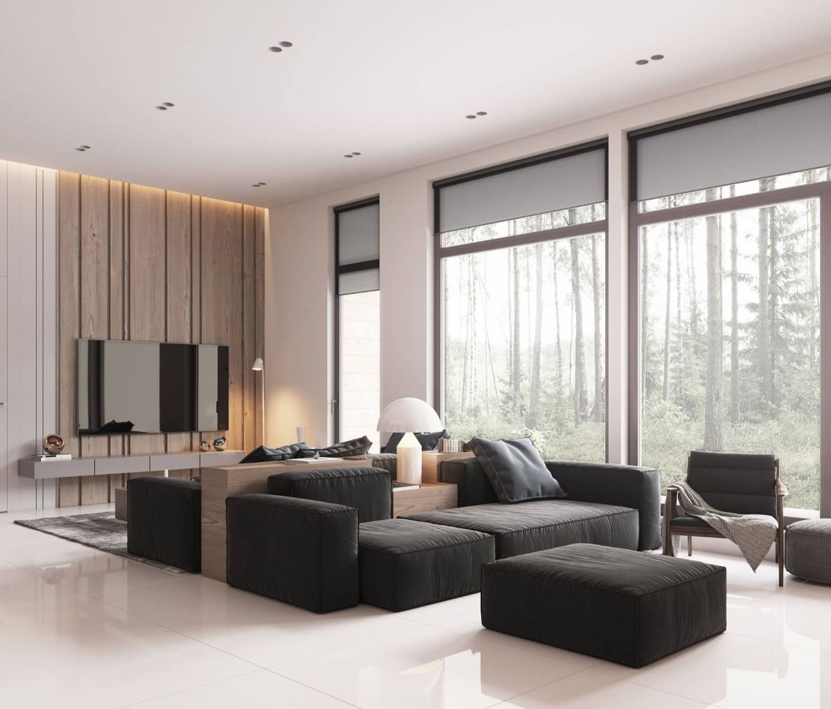 Современный дизайн гостиной в нейтральных тонах1.Яркое световое оформление и много естественного света.