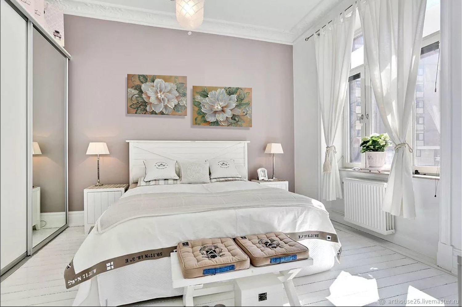 Картины зрительно расширяют пространство и добавляют помещению изюминку. Какие картины лучше вешать в спальне? Можно выбрать одно большое полотно, но желательно, чтобы изображение было светлым. Что касается сюжета, он может быть совершенно любым. Здесь все зависит от предпочтений хозяев комнаты. Если хочется добавить темного цвета, достаточно ограничиться черной рамой для обрамления картины.
